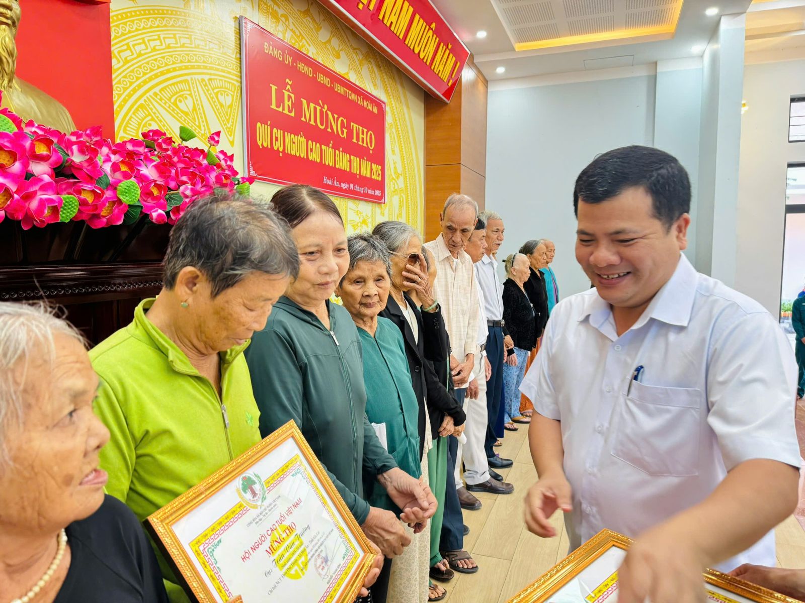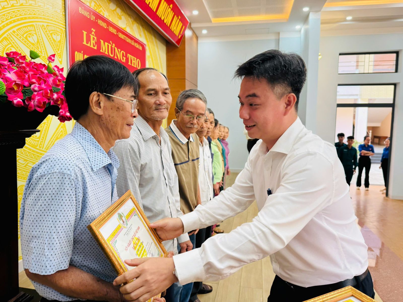 Tại buổi lễ, các đồng chí lãnh đạo xã đã tổ chức trao tặng Thiếp mừng thọ, trao quà chúc thọ cho 186 cụ ông, cụ bà tròn 95,85,80,75,70 tuổi trên địa bàn xã Ân Đức cũ.