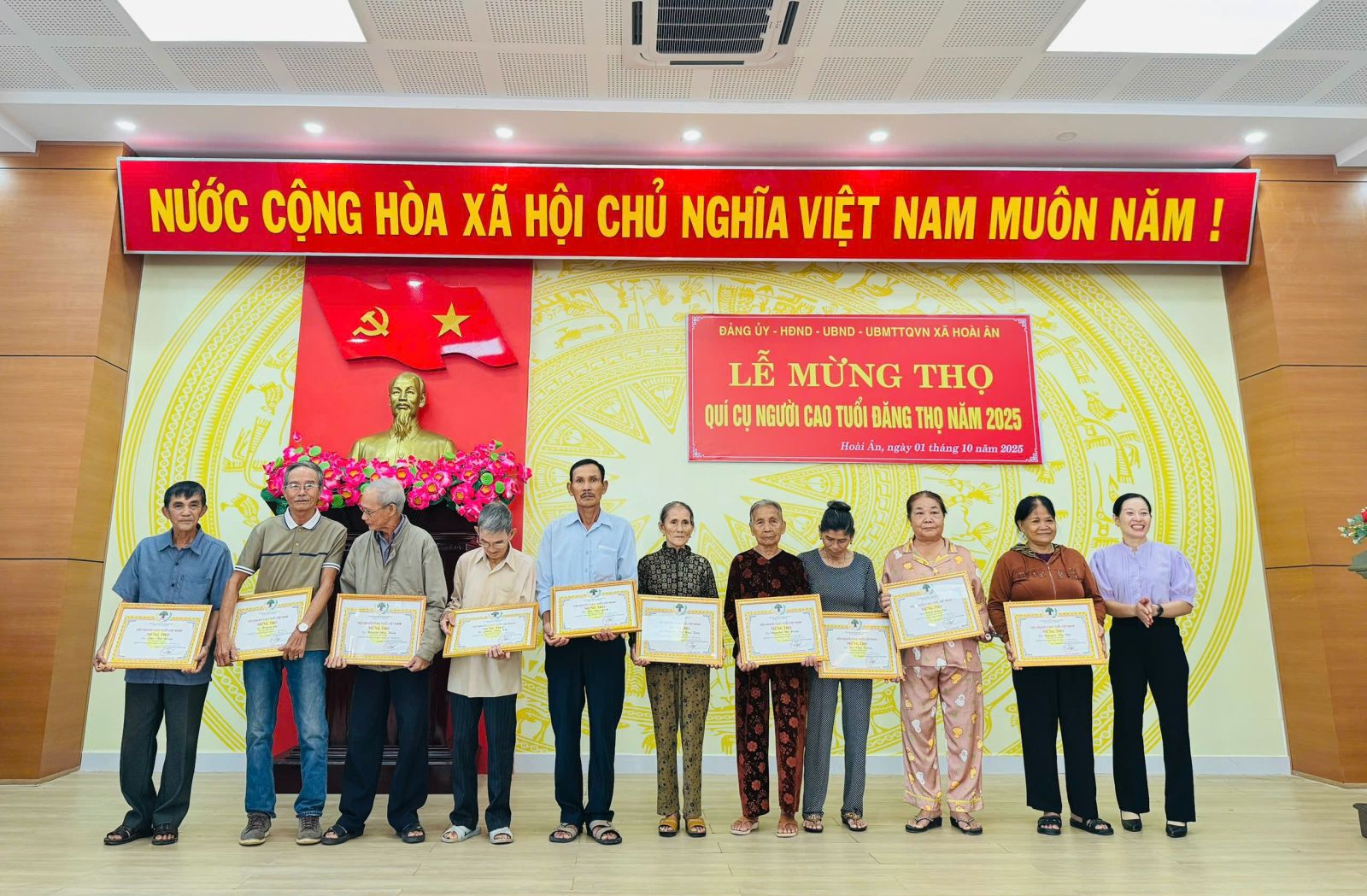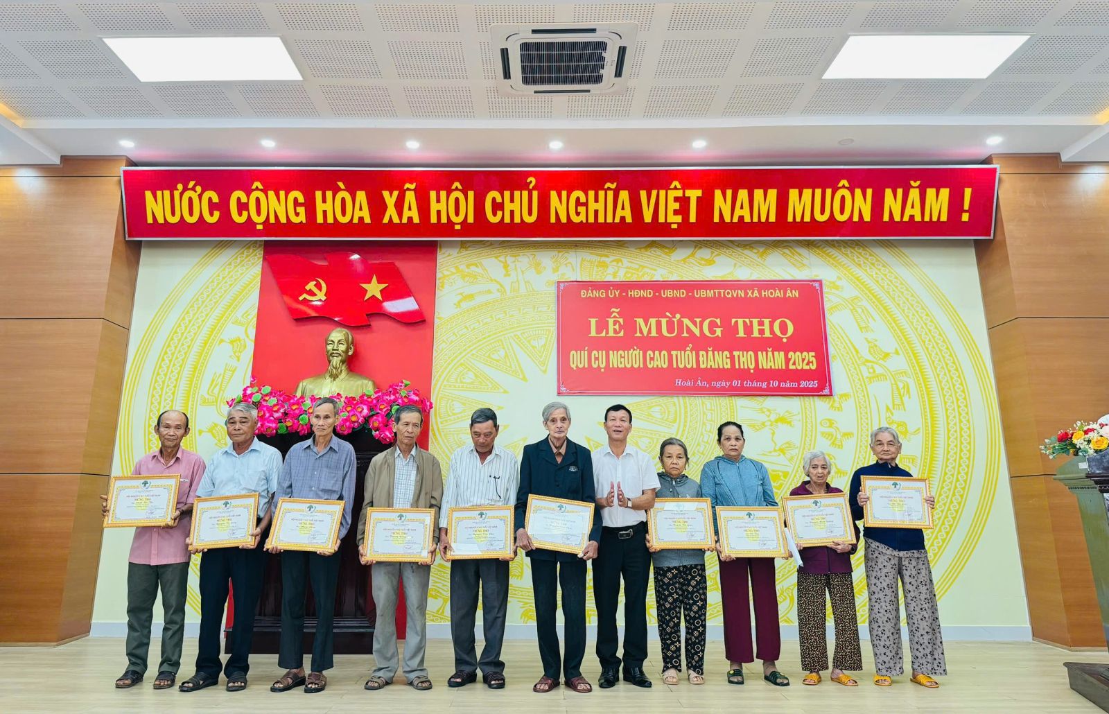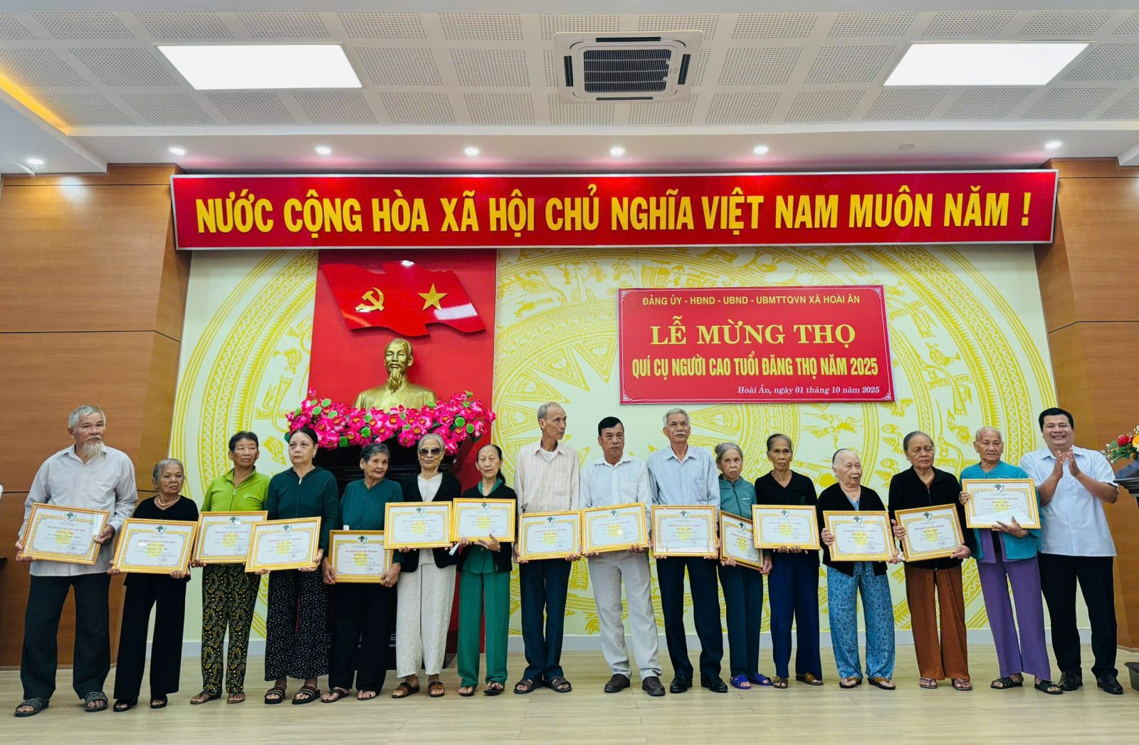 Nhằm thể hiện sự quan tâm, chăm sóc của Đảng, Nhà nước và toàn xã hội đối với người cao tuổi, sáng ngày 1/10, Đảng ủy – HĐND – UBND – UBMTTQVN xã đã tổ chức gặp mặt trao thiếp mừng thọ cho các cụ người cao tuổi. Dự lễ gặp mặt có đồng chí Nguyễn Văn Hòa – BT Đảng ủy, Chủ tịch HĐND xã; Đồng chí Mai Văn Lên – UV BTV Đảng ủy, Chủ tịch UBMTTQVN xã; Đồng chí Trần Anh Hoàng Vũ – PCT UBND xã; Đồng chí Mai Thị Ngọc Nhơn – Phó trưởng ban VHXH- HĐND xã.